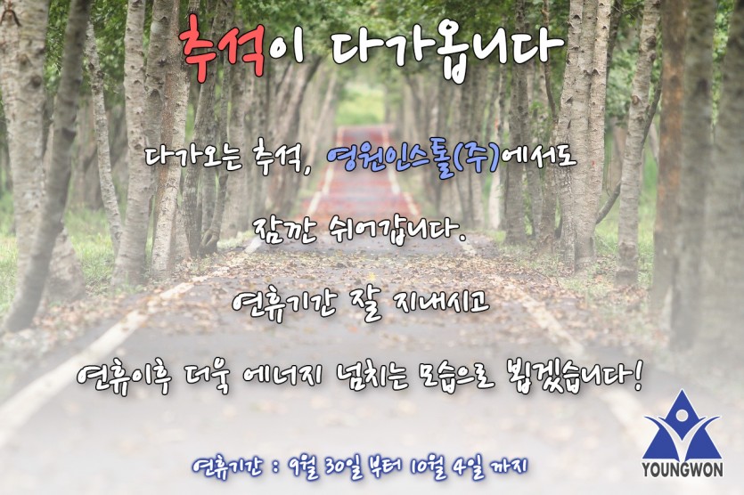 추석 연휴기간 공지 페이지 정보 작성자 영원인스톨 댓글 0건 조회Hit 8,746회 작성일Date 20-09-21 09:25 본문 명절 잘 보내세요~! 목록 답변 이전글영원인스톨(주) 본사 이전 안내 20.10.21 다음글포스코건설 트렌치&그레이팅부문 협력업체 등록 20.03.13 댓글목록 댓글목록 등록된 댓글이 없습니다.